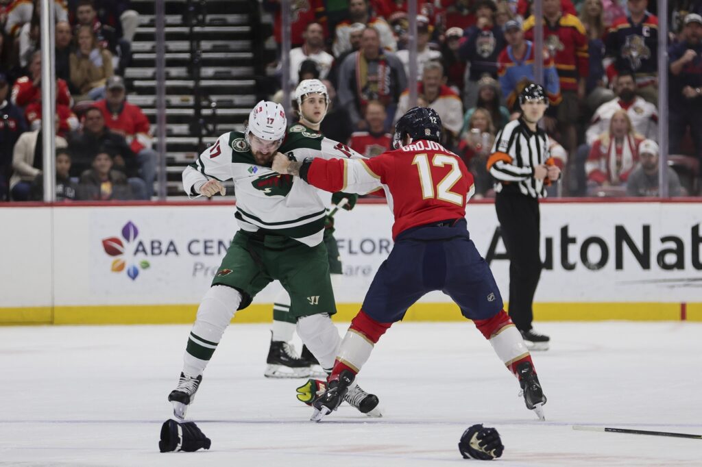 Fleury got hit up high by Florida’s Will Lockwood, who was immediately mobbed by Minnesota players coming to Fleury’s defense. Once Lockwood was out of the penalty box for interference, Wild tough guy Brandon Duhaime delivered numerous punches to him in a fight.