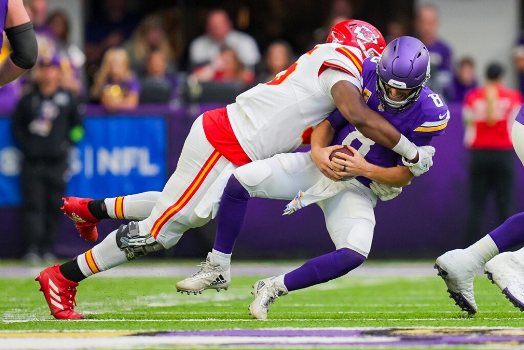 The Vikings dropped to 1-4 with a 27-20 loss to the Kansas City Chiefs in Minneapolis and there will be a boatload of moments to react to, including possibly field turf injuries to Justin Jefferson and Travis Kelce, blown pass interference rulings and questionable game management decisions by Vikings head coach Kevin O’Connell. Meantime, here are five things that really stood out…