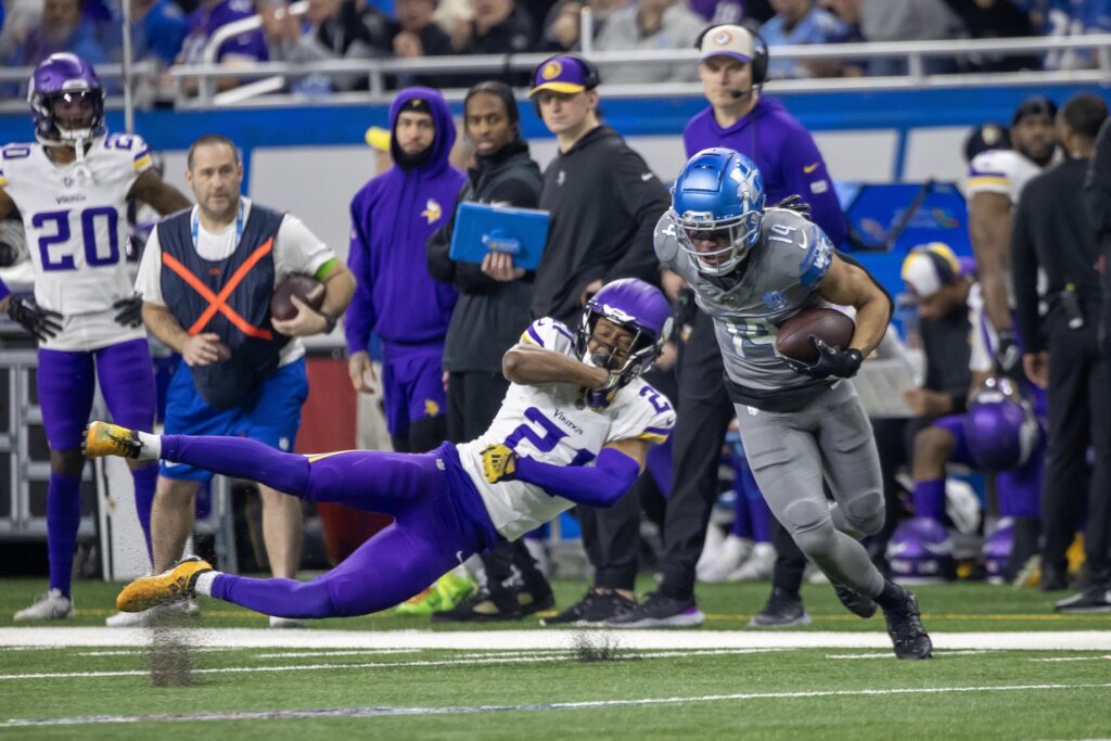After a 42-yard punt return by Khalif Raymond, the Lions went 52 yards in five plays and scored on Jared Goff’s two-yard touchdown pass to rookie tight end Sam Laporta. Minnesota responded with a three-and-out and the Lions went 64 yards in eight plays with Jahmyr Gibbs making it 13-0 on a three-yard rushing touchdown.