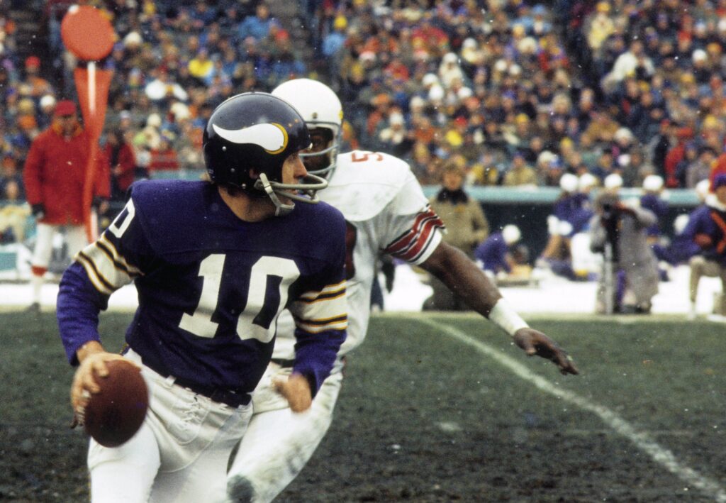 The Vikings had gold trim around the white numbers on their purple jerseys when they were founded in 1961, but removed the gold in 1969. The purple and white jerseys became synonymous with the “Purple People Eaters” that were led by Tarkenton and appeared in four Super Bowls during the 1970s.