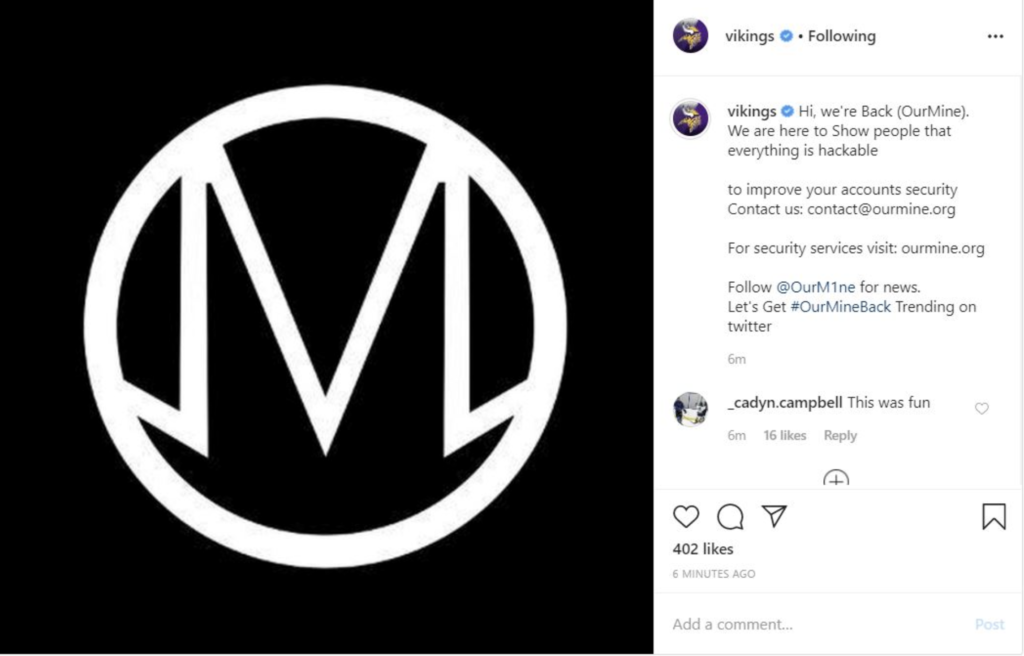 The hacking was carried out by a group called OurMine, with all affected teams posting messages from OurMine along with the organization’s logo. Here’s a view of Minnesota’s Instagram account.