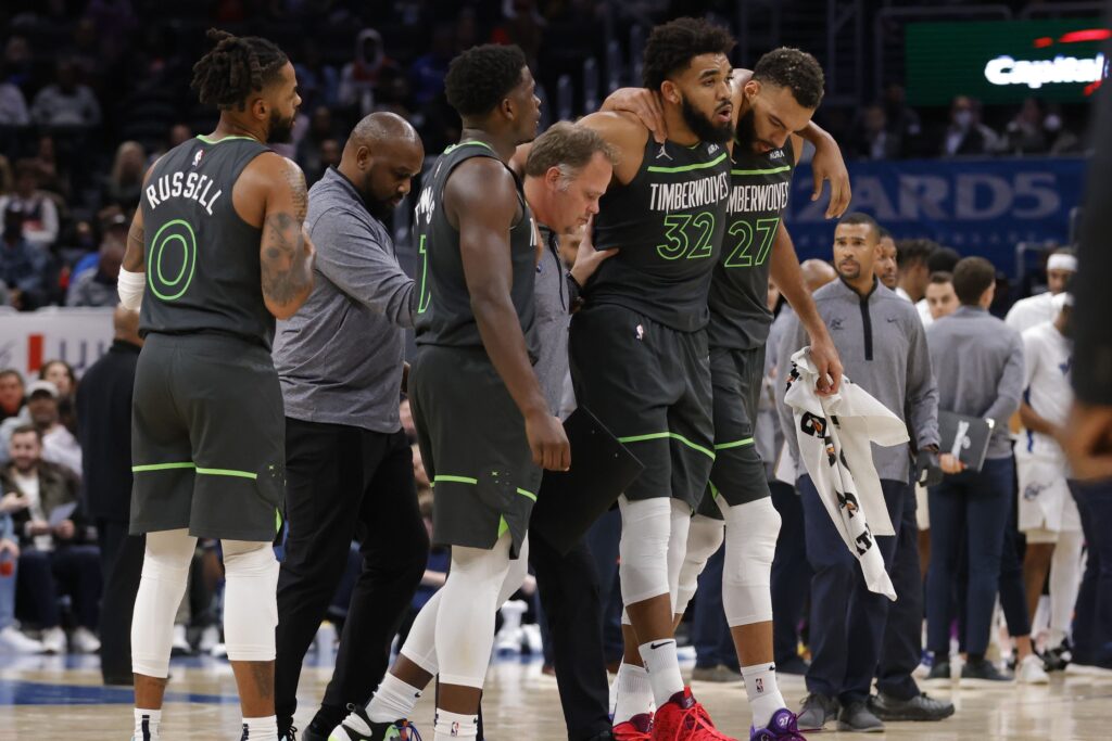 Minnesota Timberwolves Karl-Anthony Towns was helped off the court after suffering a leg injury in the third quarter of their game with the Washington Wizards on Monday night.