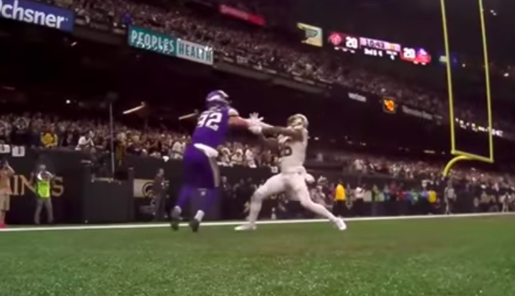 Nothing to see here. Just a #Saints DB holding #Vikings Kyle Rudolph at the top of the route. No flag. Catapulted himself back into the play. No blood… no foul I guess… pic.twitter.com/VfocgQ74ye