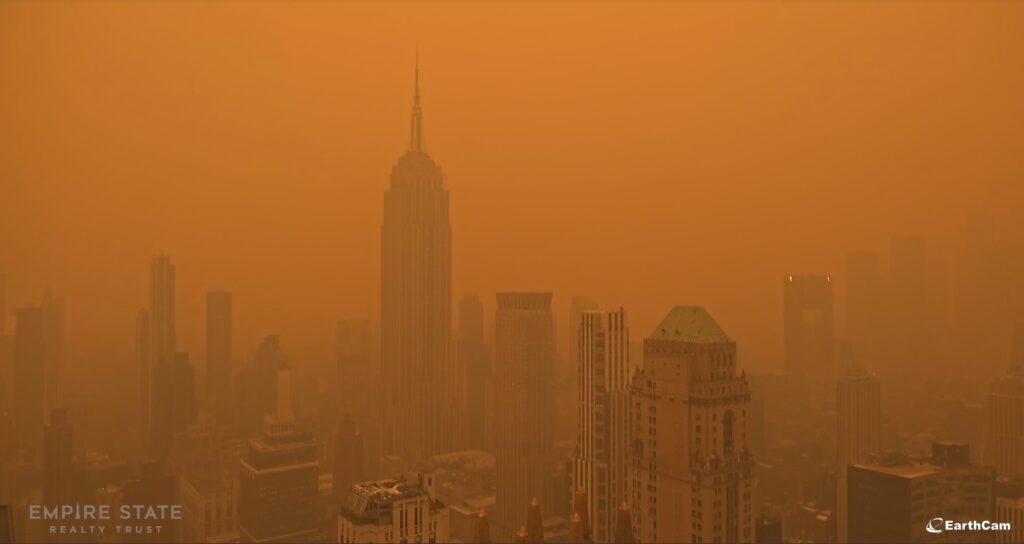 The photo at the top of the story is a view of the Empire State Building on Wednesday afternoon, with the orange glow caused by limited light penetrating the veil of smoke in the sky.