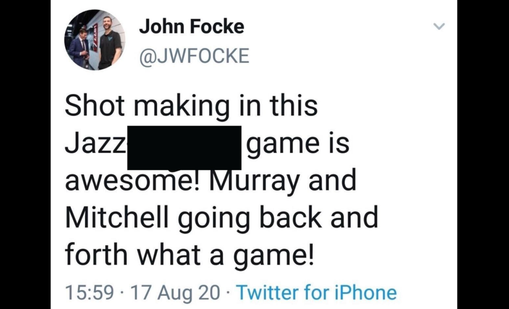 “Shot making in this Jazz-(N-word) game is awesome! Murray and Mitchell going back and forth what a game!” read Focke’s tweet, which was subsequently deleted.