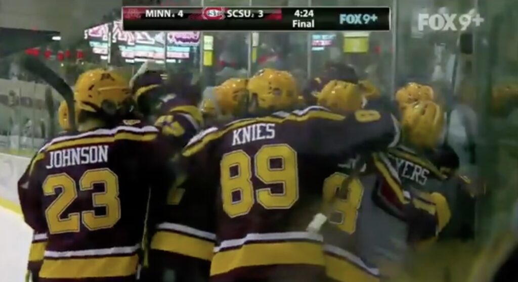 The Gophers won 4-3 in overtime thanks to a Blake McLaughlin goal just seconds after he blatantly hooked St. Cloud’s Nick Perbix, only for the referee not to blow his whistle.