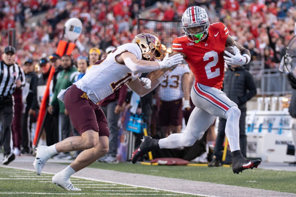 Henderson scored a 75-yard touchdown on the first play of the second half, before Gophers QB Athan Kaliakmanis fumbled on the very next play, with Marvin Harrison Jr.’s 4-yard touchdown reception following a few moments later to put the home side 27-0 ahead.