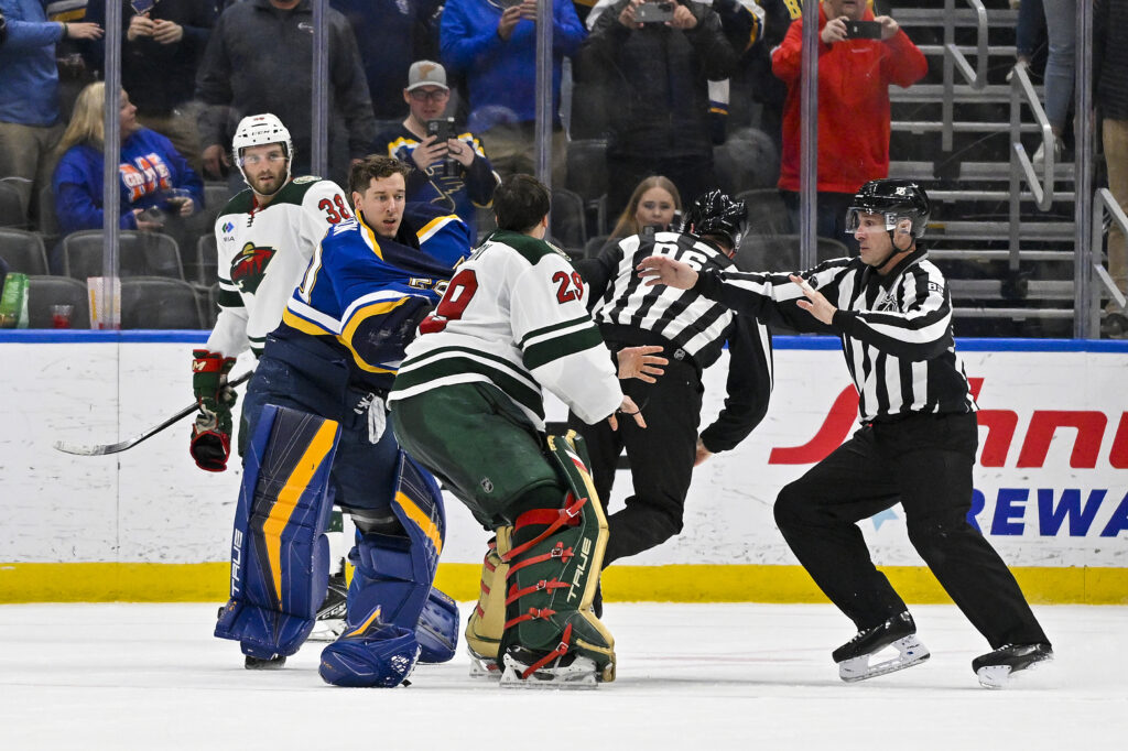 That punch set off a mass scrum that nearly led to a goalie fight as Minnesota’s Marc-Andre Fluery left his crease, took off his helmet and gloves and was gearing up for a fight until the linesmen stepped in and prevented it, which, fittingly, was about to happen on Ric Flair Night at the Enterprise Center in St. Louis.