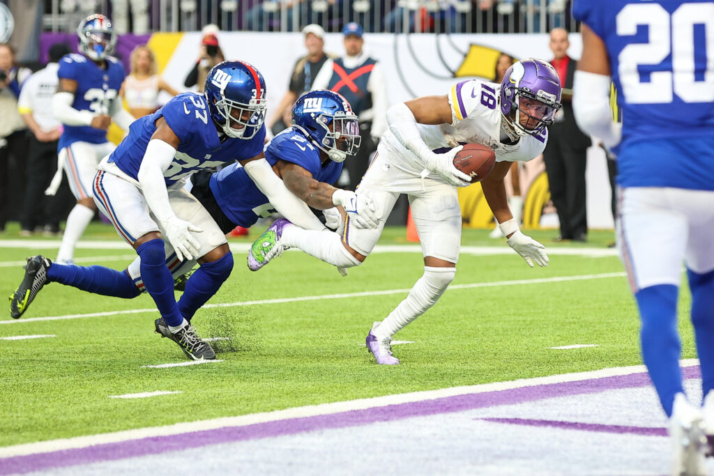On the down side, the Vikings’ two starting guards allowed more sacks and more QB pressures than any other tandem in the NFL. Likewise, Giants right tackle Evan Neal had the third worst pass blocking efficiency at his position. And on defense, Vikings nickel corner Chandon Sullivan led the NFL in receptions allowed into his coverage with 72. On New York’s side, linebackers Micah McFadden and Tae Crowder have each allowed over 120 QB ratings on throws into their coverage.