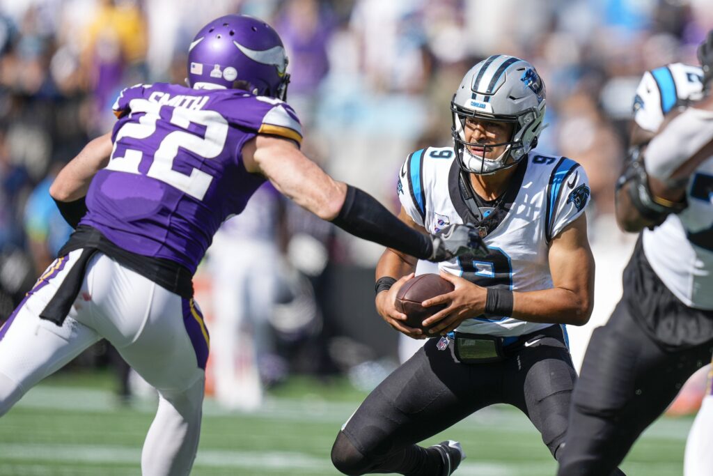 They certainly were on the field a lot. With the Vikings’ offense sputtering, the defense spent 38:29 chasing around the No. 1 overall pick. They sacked him five times, including twice from Smith in the red zone with the Panthers down by eight points in the waning moments.
