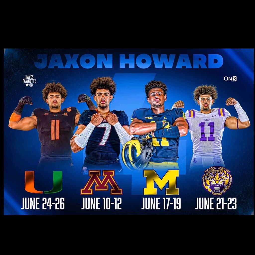 Howard will start his official visits by heading to the University of Minnesota June 10-12, followed by Michigan June 17-19, LSU June 21-23 and Miami June 24-26.
