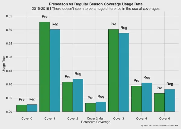 There are only small differences in the coverage teams run, and Menon explains the discrepancies between preseason and regular season for Cover 1 and Cover 3 simply.