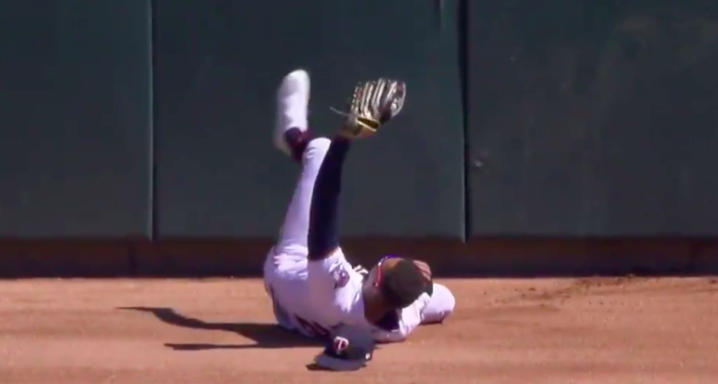 Byron Buxton pulled off a circus catch against the center field wall in Sunday’s Twins game against the Tigers.