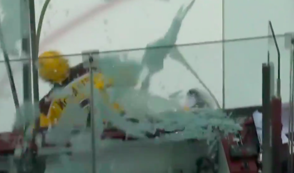 Crashing the net in hockey is a good thing. Crashing the glass however is not.