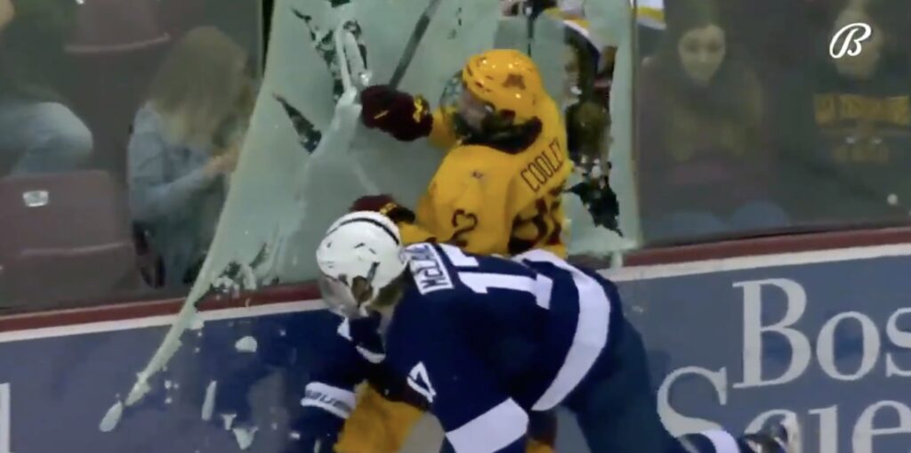 The hit went down with just under eight minutes left in the game when Cooley corraled a loose puck in the Gophers’ defensive zone. Just as Cooley was making his way along the boards, McClain came charging in and delivered the glass-shattering impact.