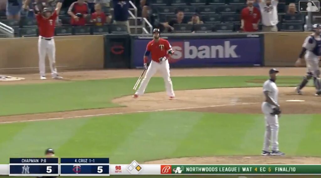 In the 9th, Chapman didn’t record a single out as Jorge Polanco singled before Donaldson homered. Willians Astudillo then singled before Cruz’s blast.