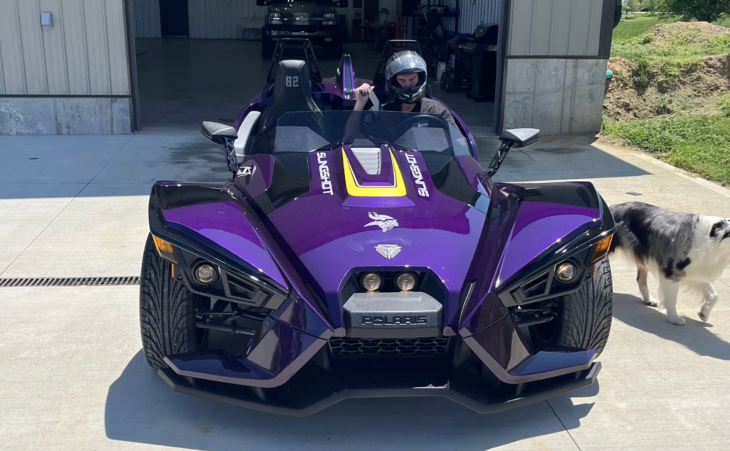 The vehicle is available to pick up or have shipped at the buyer’s expense, according to the tweet. The slingshot has a purple exterior, with a Vikings logo at the front.